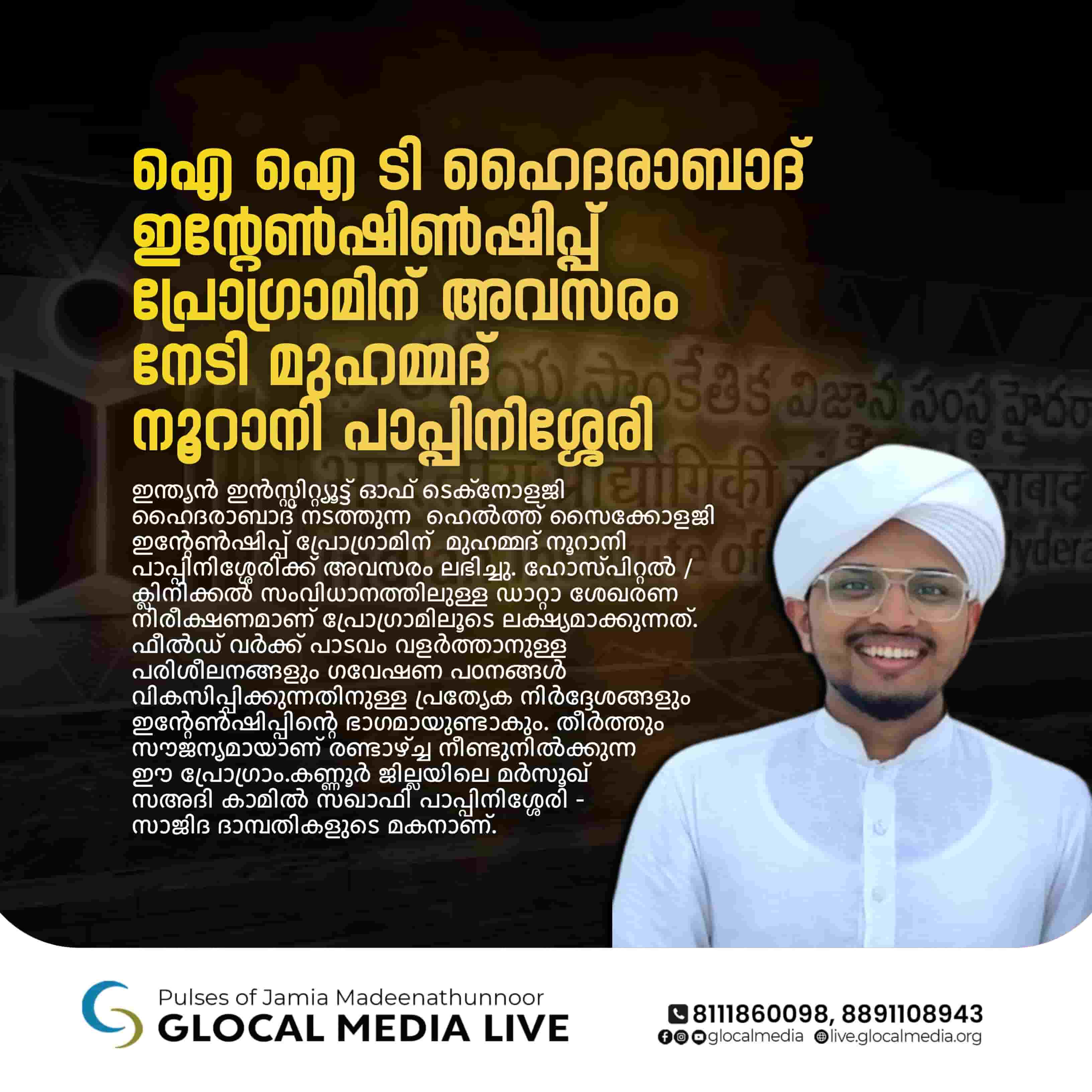 കോഴിക്കോട് : ഇന്ത്യൻ ഇൻസ്റ്റിറ്റ്യൂട്ട് ഓഫ് ടെക്നോളജി ഹൈദരാബാദ് നടത്തുന്ന ഹെൽത്ത് സൈക്കോളജി ഇന്റേൺഷിപ്പ് പ്രോഗ്രാമിന് മുഹമ്മദ് നൂറാനി പാപ്പിനിശ്ശേരിക്ക് അവസരം ലഭിച്ചു. ഹോസ്പിറ്റൽ /ക്ലിനിക്കൽ സംവിധാനത്തിലുള്ള ഡാറ്റാ ശേഖരണ നിരീക്ഷണമാണ് പ്രോഗ്രാമിലൂടെ ലക്ഷ്യമാക്കുന്നത്. ഫീൽഡ് വർക്ക് പാടവം വളർത്താനുള്ള പരിശീലനങ്ങളും ഗവേഷണ പഠനങ്ങൾ വികസിപ്പിക്കുന്നതിനുള്ള പ്രത്യേക നിർദ്ദേശങ്ങളും ഇൻ്റേൺഷിപ്പിന്റെ ഭാഗമായുണ്ടാകും. തീർത്തും സൗജന്യമായാണ് രണ്ടാഴ്ച്ച നീണ്ടുനിൽക്കുന്ന ഈ പ്രോഗ്രാം.കണ്ണൂർ ജില്ലയിലെ മർസൂഖ് സഅദി കാമിൽ സഖാഫി പാപ്പിനിശ്ശേരി – സാജിദ ദാമ്പതികളുടെ മകനാണ്. 2023- 24