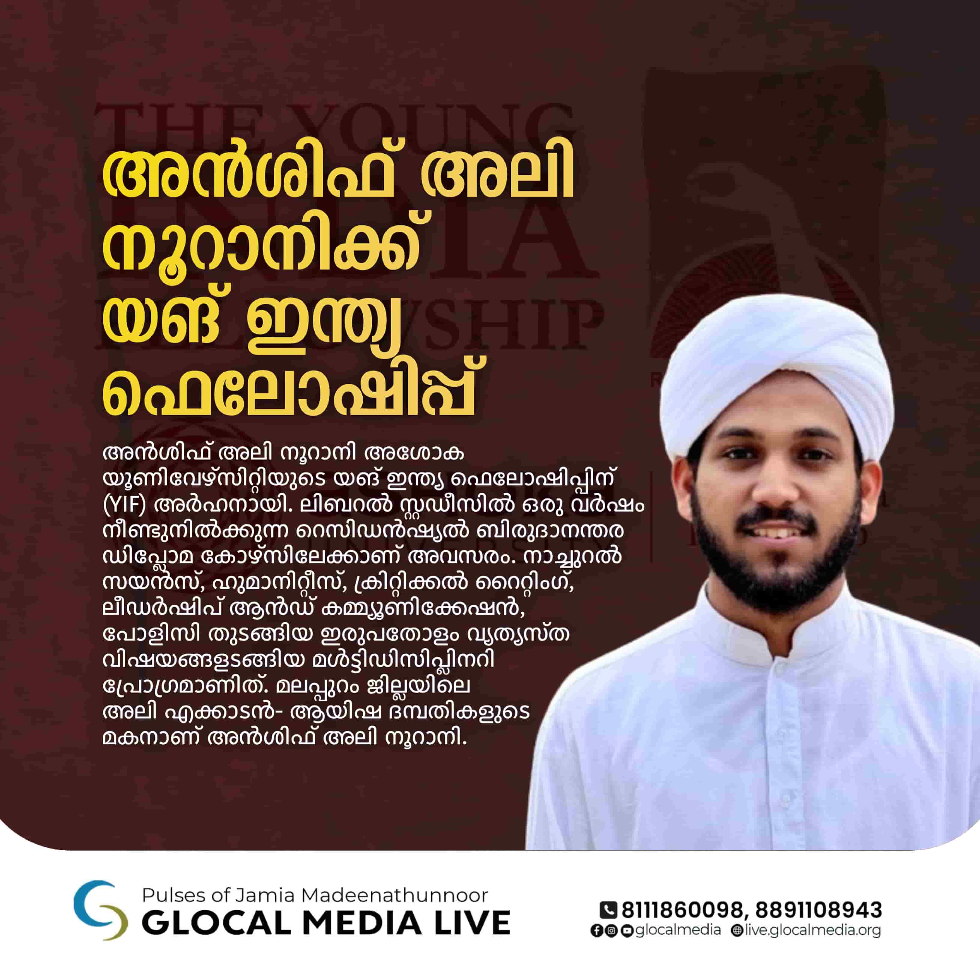 മർകസ് ഗാർഡൻ: അൻശിഫ് അലി നൂറാനി അശോക യൂണിവേഴ്സിറ്റിയുടെ യങ് ഇന്ത്യ ഫെലോഷിപ്പിന് (YIF) അർഹനായി.ലിബറൽ സ്റ്റഡീസിൽ ഒരു വർഷം നീണ്ടുനിൽക്കുന്ന റെസിഡൻഷ്യൽ ബിരുദാനന്തര ഡിപ്ലോമ കോഴ്‌സിലേക്കാണ് അവസരം. നാച്ചുറൽ സയൻസ്, ഹുമാനിറ്റീസ്, ക്രിറ്റിക്കൽ റൈറ്റിംഗ്‌, ലീഡർഷിപ് ആൻഡ് കമ്മ്യൂണിക്കേഷൻ, പോളിസി തുടങ്ങിയ ഇരുപതോളം വ്യത്യസ്ത വിഷയങ്ങളടങ്ങിയ മൾട്ടിഡിസിപ്ലിനറി പ്രോഗ്രമാണിത്. സാമൂഹിക പ്രതിബദ്ധതയുള്ള ലീഡേഴ്സിനെയും ഗവേഷകരെയും സൃഷ്ടിക്കുകയാണ് പ്രോഗ്രാമിന്റെ ലക്ഷ്യം. രാജ്യത്തിനകത്തും പുറത്തുമുള്ള വിവിധ മേഖലകളിലെ പ്രഗത്ഭരുടെ മെന്റർഷിപ്പും കോഴ്‌സിൻ്റെ ഭാഗമായുണ്ടാകും. നേരത്തെ യൂറോപ്പ്യൻ മാസ്റ്റേഴ്സ് ഇൻ