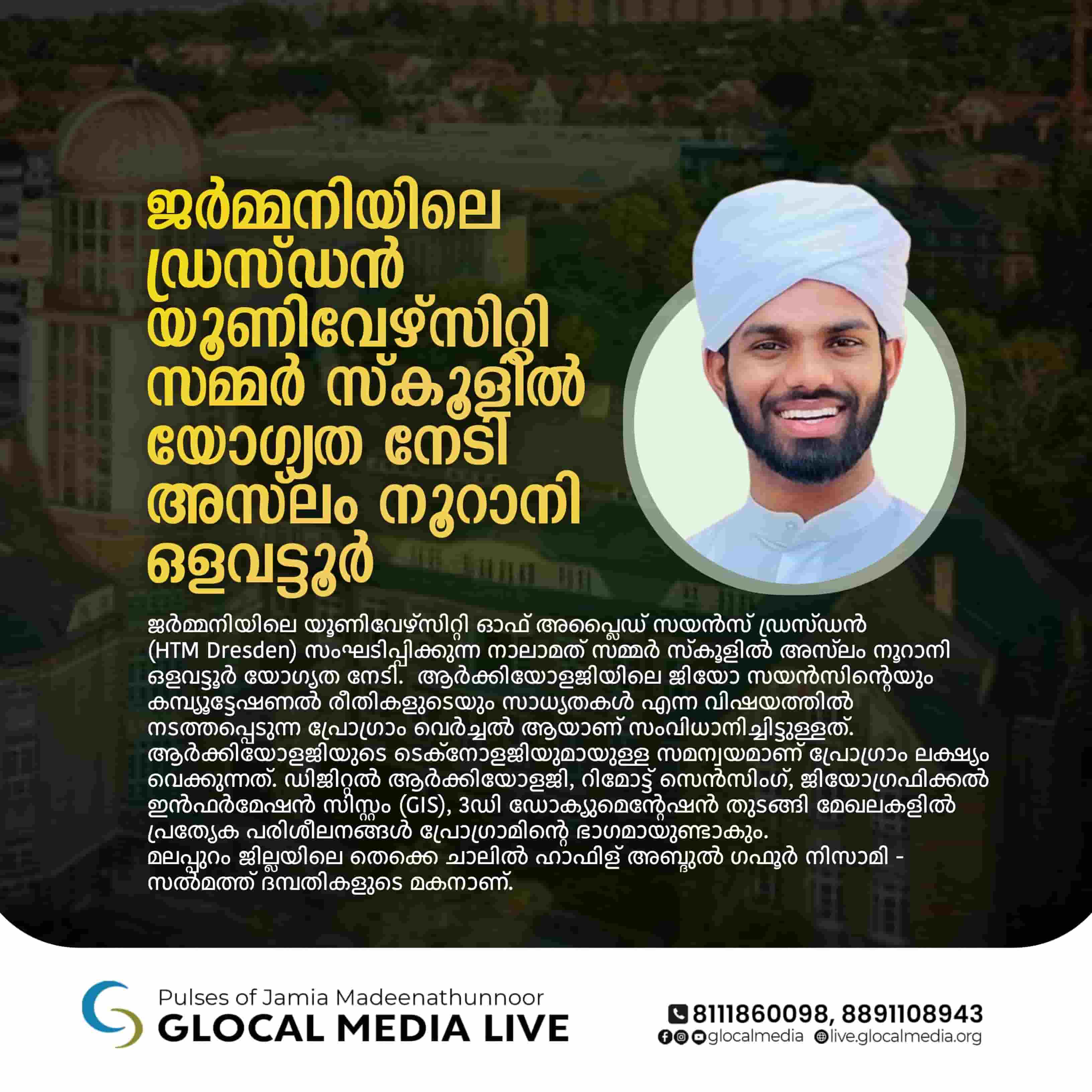 കോഴിക്കോട്: ജർമ്മനിയിലെ യൂണിവേഴ്സിറ്റി ഓഫ് അപ്ലൈഡ് സയൻസ് ഡ്രസ്ഡന്‍ (HTM Dresden) സംഘടിപ്പിക്കുന്ന നാലാമത് സമ്മർ സ്കൂളിൽ അസ്‌ലം നൂറാനി ഒളവട്ടൂർ യോഗ്യത നേടി. ആർക്കിയോളജിയിലെ ജിയോ സയൻസിന്റെയും കമ്പ്യൂട്ടേഷണൽ രീതികളുടെയും സാധ്യതകൾ എന്ന വിഷയത്തിൽ നടത്തപ്പെടുന്ന പ്രോഗ്രാം വെർച്ചൽ ആയാണ് സംവിധാനിച്ചിട്ടുള്ളത്. ആർക്കിയോളജിയുടെ ടെക്നോളജിയുമായുള്ള സമന്വയമാണ് പ്രോഗ്രാം ലക്ഷ്യം വെക്കുന്നത്. ഡിജിറ്റൽ ആർക്കിയോളജി, റിമോട്ട് സെൻസിംഗ്, ജിയോഗ്രഫിക്കൽ ഇൻഫർമേഷൻ സിസ്റ്റം (GIS), 3ഡി ഡോക്യുമെൻ്റേഷൻ തുടങ്ങി മേഖലകളിൽ പ്രത്യേക പരിശീലനങ്ങൾ പ്രോഗ്രാമിൻ്റെ ഭാഗമായുണ്ടാകും.നേരത്തെ ചെന്നൈ ഇൻസ്റിറ്റ്യൂട്ട്