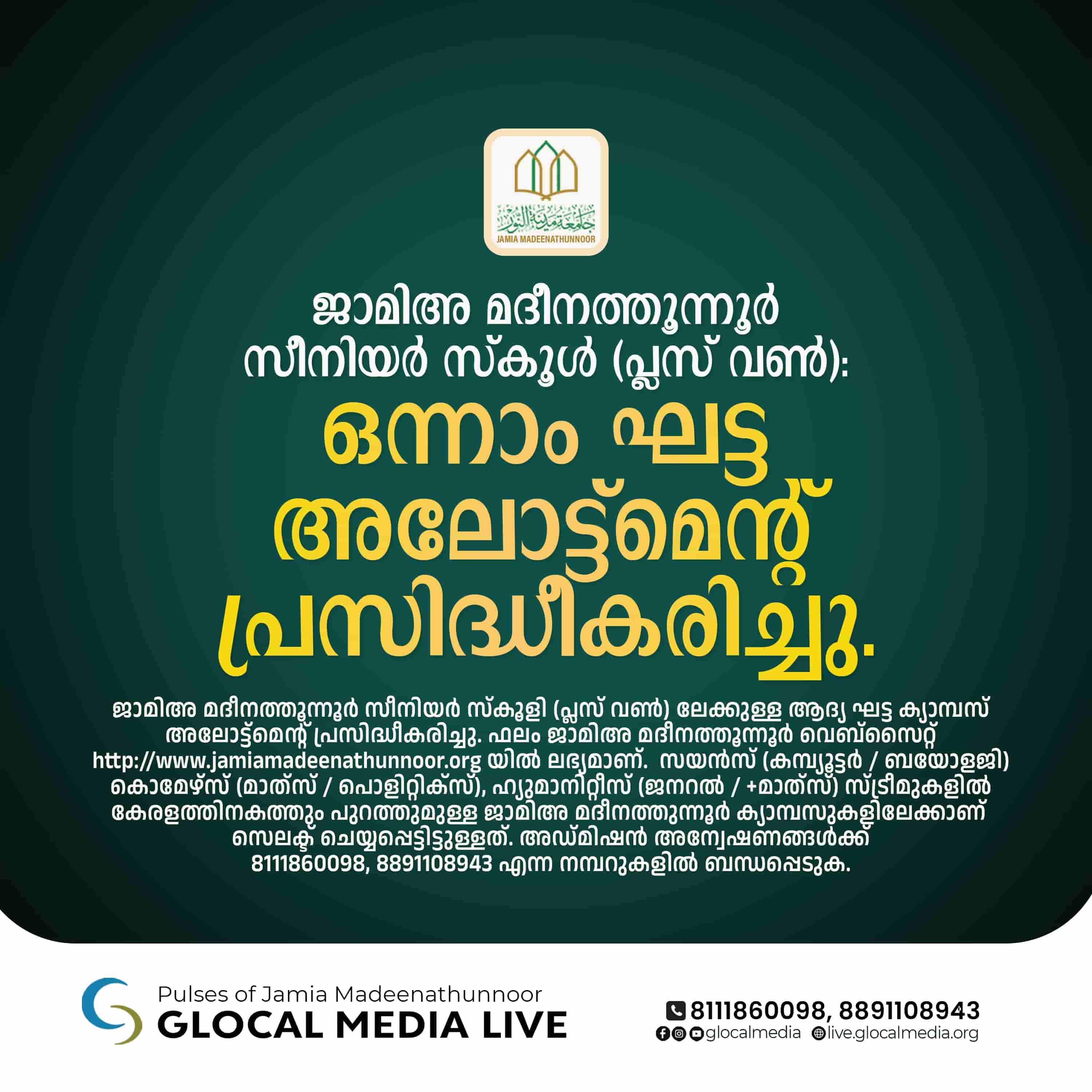 ജാമിഅ മദീനത്തൂന്നൂർ സീനിയർ സ്കൂളി (പ്ലസ് വൺ) ലേക്കുള്ള ആദ്യ ഘട്ട ക്യാമ്പസ്‌ അലോട്ട്മെന്റ് പ്രസിദ്ധീകരിച്ചു. ഫലം ജാമിഅ മദീനത്തൂന്നൂർ വെബ്സൈറ്റ് http://www.jamiamadeenathunnoor.org യിൽ ലഭ്യമാണ്.സ്കൂൾ പത്താം ക്ലാസ് കഴിഞ്ഞവർക്ക് ഇസ്ലാമിക് സ്റ്റഡീസിൽ മുഖ്തസർ ബിരുദത്തോടൊപ്പം വിവിധ സ്പെഷലൈസേഷനും സ്കൂൾ പഠനവും നൽകുന്ന സംവിധാനമാണ് സീനിയർ സ്കൂൾ.സയൻസ് (കമ്പ്യൂട്ടർ / ബയോളജി) കൊമേഴ്സ് (മാത്‌സ് / പൊളിറ്റിക്സ്), ഹ്യുമാനിറ്റീസ് സ്ട്രീമുകളും ലഭ്യമാണ്.ഒന്നാംഘട്ട അലോട്ട്മെൻ്റിൽ സീറ്റ് ലഭിച്ച വിദ്യാർത്ഥികളുടെ രജിസ്റ്റർ നമ്പറും അവരുടെ ക്യാമ്പസും ഉൾപ്പെടുത്തിയിട്ടുള്ള ലിസ്റ്റ് താഴെ