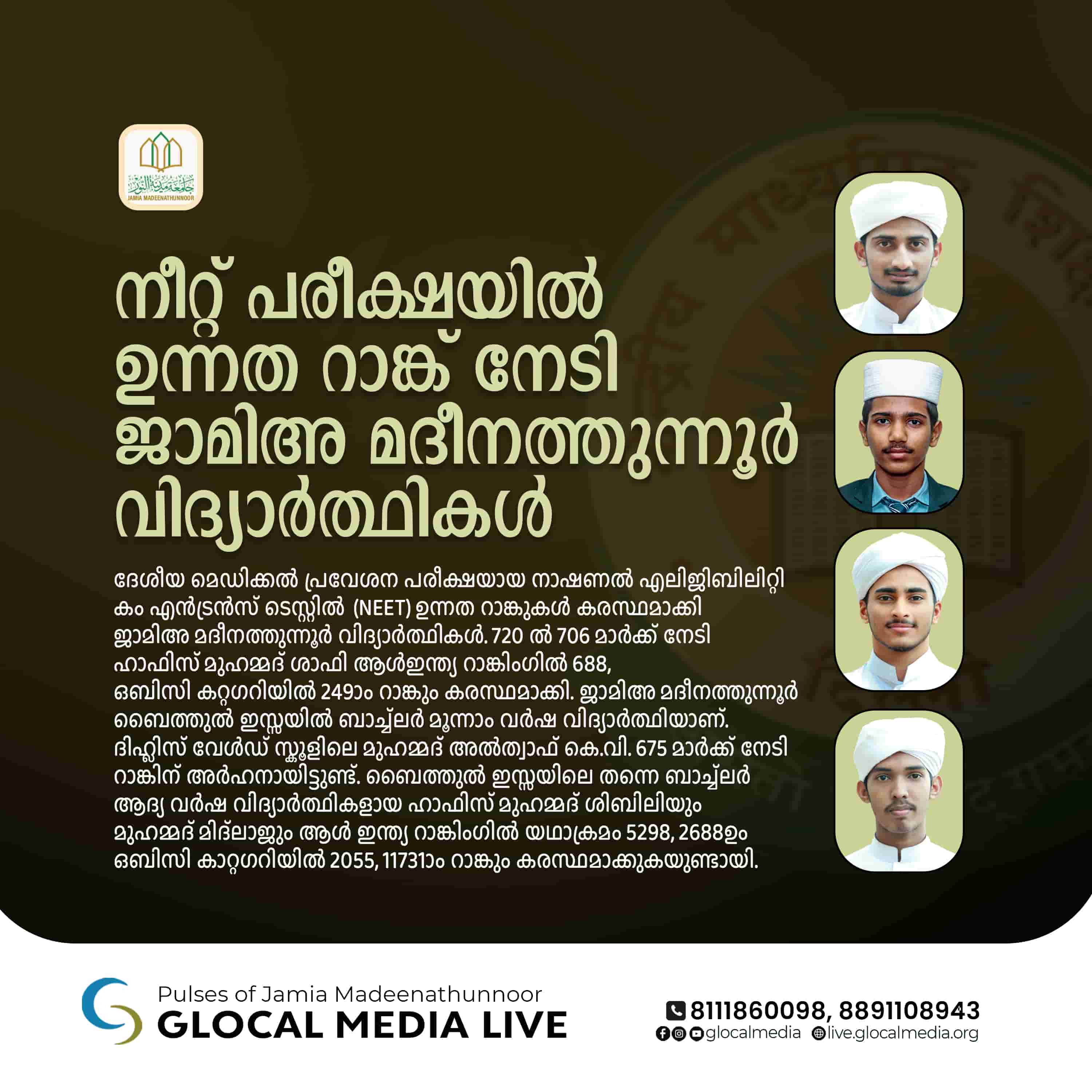 ദേശീയ മെഡിക്കൽ പ്രവേശന പരീക്ഷയായ നാഷണൽ എലിജിബിലിറ്റി കം എൻട്രൻസ് ടെസ്റ്റിൽ (NEET) ഉന്നത റാങ്കുകൾ കരസ്ഥമാക്കി ജാമിഅ മദീനത്തുന്നൂർ വിദ്യാർത്ഥികൾ.