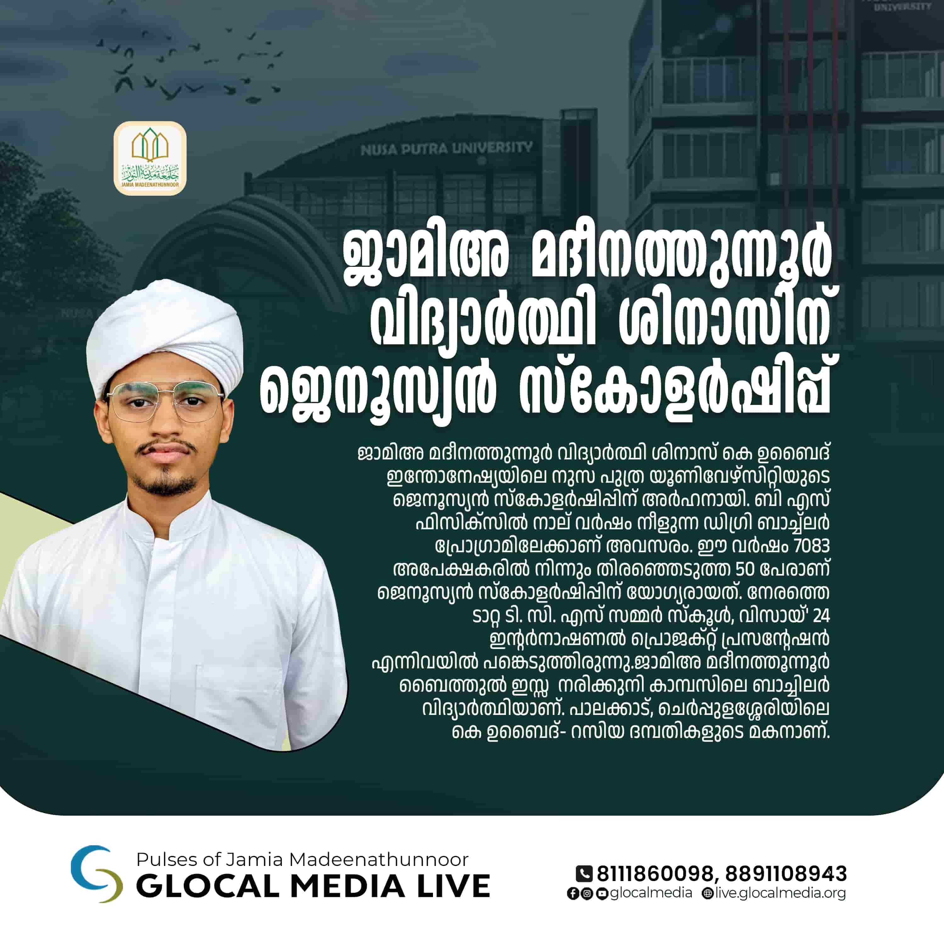 ജാമിഅ മദീനത്തുന്നൂർ വിദ്യാർത്ഥി ശിനാസ് കെ ഉബൈദ് ഇന്തോനേഷ്യയിലെ നുസ പുത്ര യൂണിവേഴ്സിറ്റിയുടെ ജെനൂസ്യൻ സ്കോളർഷിപ്പിന് അർഹനായി.