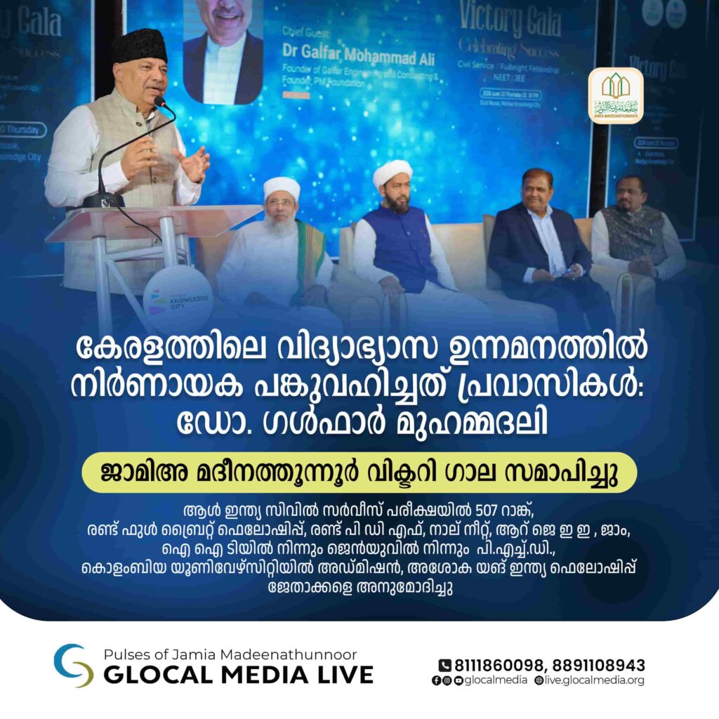 കേരളത്തിലെ വിദ്യാഭ്യാസ ഉന്നമനത്തിൽ നിർണായക പങ്കുവഹിച്ചത് പ്രവാസികൾ: ഡോ. ഗള്‍ഫാര്‍ മുഹമ്മദലി. ജാമിഅ മദീനത്തൂന്നൂർ വിക്ടറി ഗാല സമാപിച്ചു