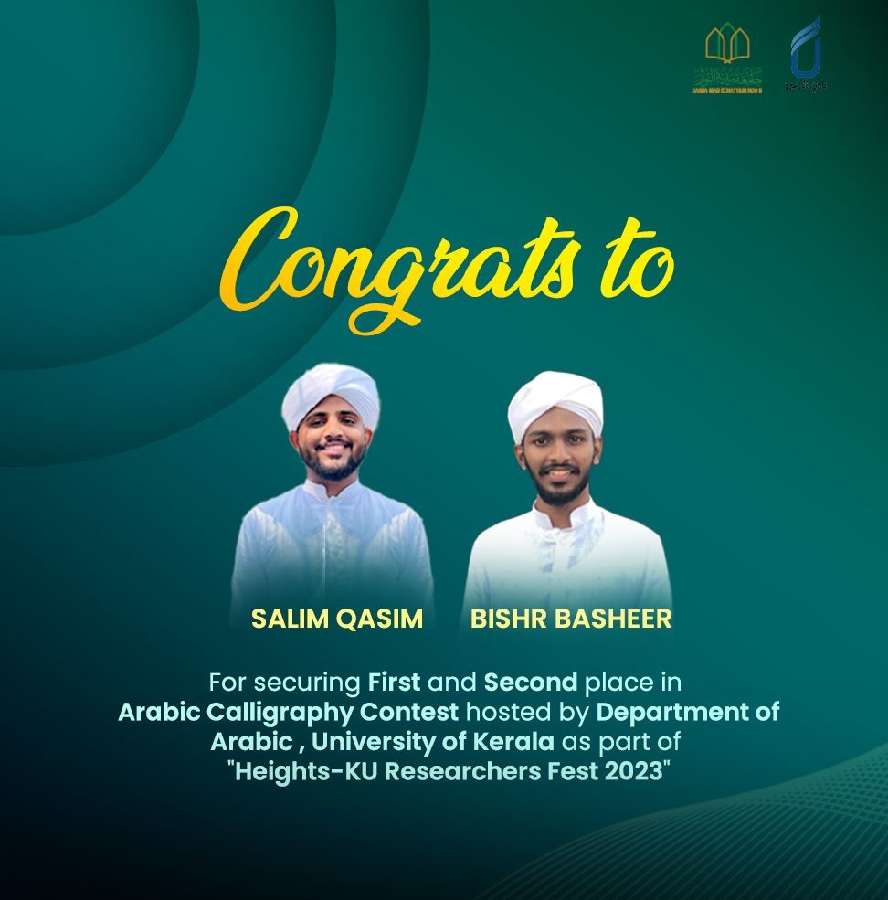 ഹൈററ്റ്സ് ‘ റിസേർച്ചേർസ് ഫെസ്റ്റ് ’23 ൻ്റെ ഭാഗമായി കേരള സർവകലാശാല അറബി വിഭാഗം സംഘടിപ്പിച്ച അറബിക് കാലിഗ്രഫി മത്സരത്തിൽ ഒന്നും രണ്ടും സ്ഥാനങ്ങൾ നേടി ജാമിഅ മദീനതുന്നൂർ വിദ്യാർഥികൾ