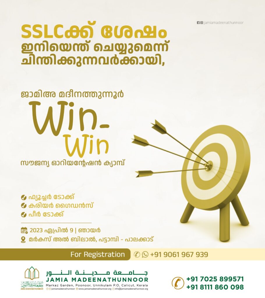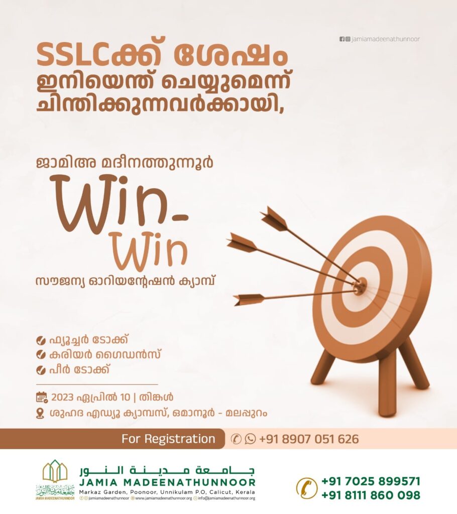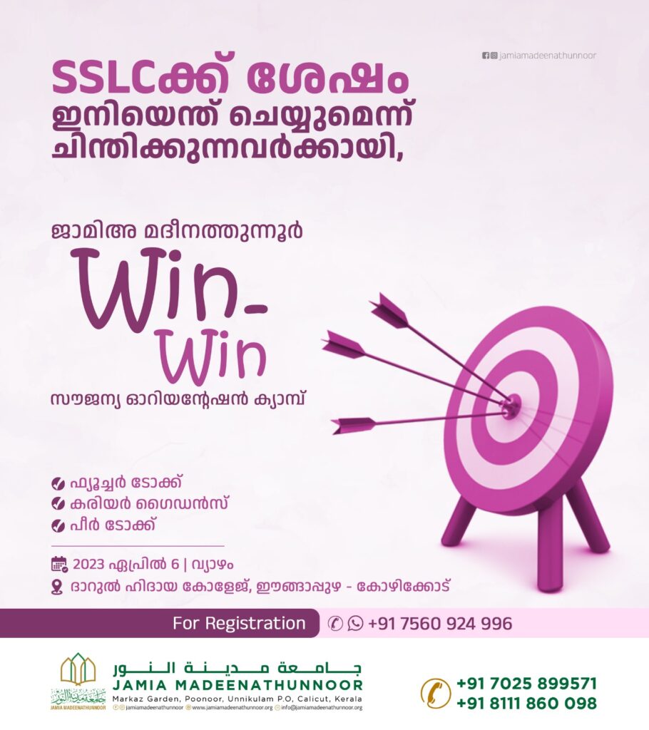 എസ് എസ് എല്‍ സി കഴിഞ്ഞവർക്കും സ്കൂൾ ഏഴാം ക്ലാസ് പൂർത്തിയായവർക്കുമുള്ള ‘വിന്‍ വിന്‍’ സൗജന്യ ഓറിയന്റേഷന്‍ പ്രോഗ്രാം ഏപ്രിൽ ഒൻപത് ഞായർ രാവിലെ 9 ന് മർകസ് അൽ ബിലാൽ പട്ടാമ്പിയിൽ നടക്കും