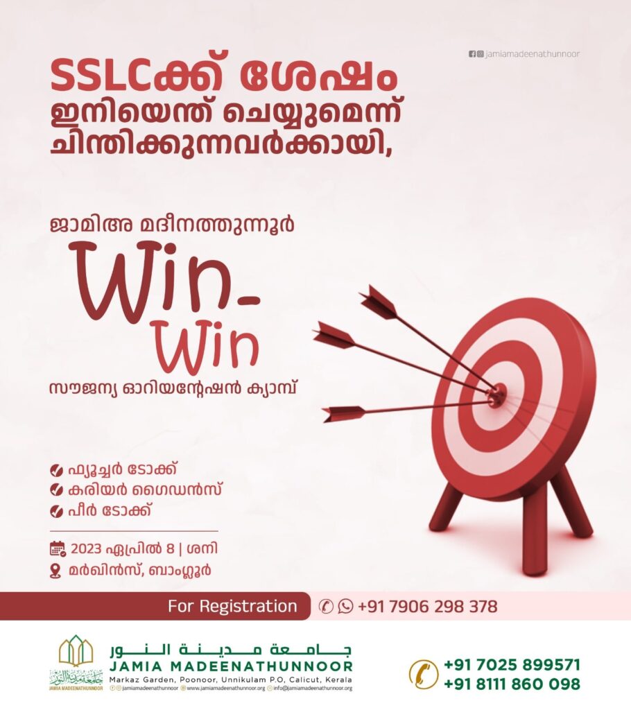 ജാമിഅ മദീനതുന്നൂർ വിൻ വിൻ സൗജന്യ ഓറിയന്റേഷന്‍ പ്രോഗ്രാം ഏപ്രിൽ പത്തിന്