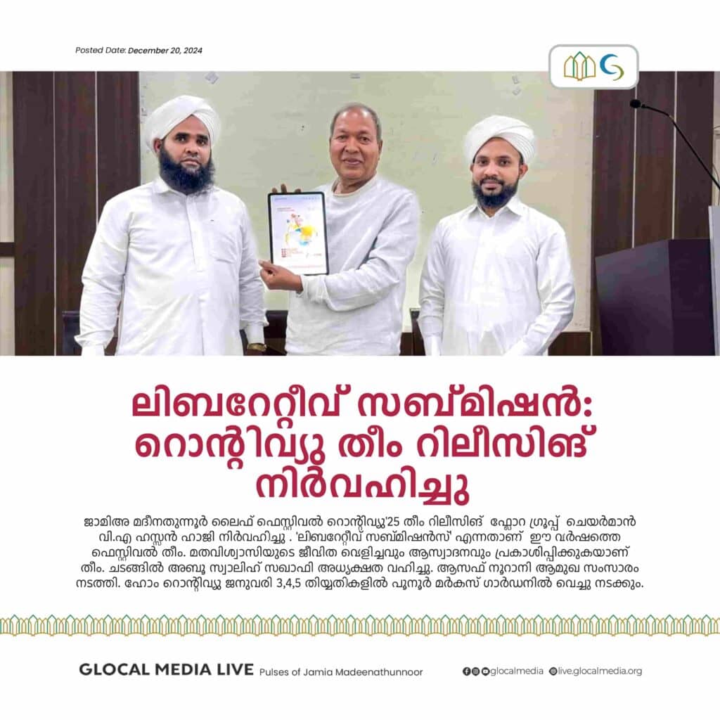 ജാമിഅ മദീനതുന്നൂർ ലൈഫ് ഫെസ്റ്റിവൽ റൊൻ്റിവ്യു’25 തീം റിലീസിങ് ഫ്ലോറ ഗ്രൂപ്പ് ചെയർമാൻ വി.എ ഹസ്സൻ ഹാജി നിർവഹിച്ചു . ‘ലിബറേറ്റീവ് സബ്മിഷൻസ്’ എന്നതാണ് ഈ വർഷത്തെ ഫെസ്റ്റിവൽ തീം.ഹോം റൊൻ്റിവ്യു ജനുവരി 3,4,5 തിയ്യതികളിൽ പൂനൂർ മർകസ് ഗാർഡനിൽ വെച്ചു നടക്കും.