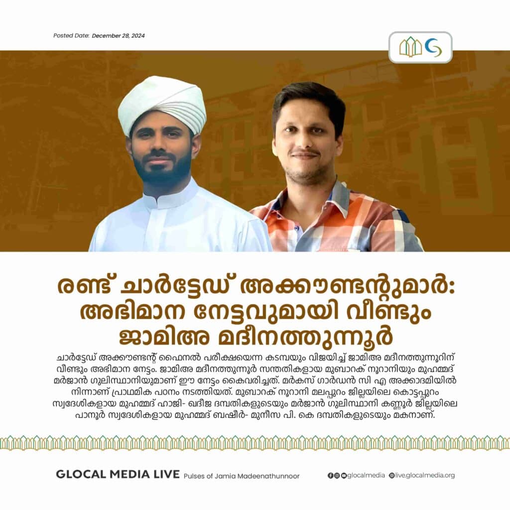 ചാർട്ടേഡ് അക്കൗണ്ടൻ്റ് ഫൈനൽ പരീക്ഷയെന്ന കടമ്പയും വിജയിച്ച് ജാമിഅ മദീനത്തുന്നൂറിന് വീണ്ടും അഭിമാന നേട്ടം. ജാമിഅ മദീനത്തുന്നൂർ സന്തതികളായ മുബാറക് നൂറാനിയും മുഹമ്മദ് മർജാൻ ഗുലിസ്ഥാനിയുമാണ് ഈ നേട്ടം കൈവരിച്ചത്.