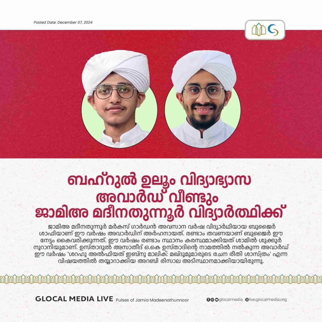 റാബിതതു തലാമീദി ബഹ്റിൽ ഉലൂം (ഒ. കെ ഉസ്താദ് ശിഷ്യ കൂട്ടായ്മ) നൽകുന്ന ബഹ്‌റുൽ ഉലൂം വിദ്യാഭ്യാസ അവാർഡ് വീണ്ടും ജാമിഅ മദീനതുന്നൂർ വിദ്യാർത്ഥിക്ക്. ജാമിഅ മദീനതുന്നൂർ മർകസ് ഗാർഡൻ അവസാന വർഷ വിദ്യാർഥിയായ ബുജൈർ ശാഫിയാണ് ഈ വർഷം അവാർഡിന് അർഹനായത്. രണ്ടാം തവണയാണ് ബുജൈർ ഈ നേട്ടം കൈവരിക്കുന്നത്. ഈ വർഷം രണ്ടാം സ്ഥാനം കരസ്ഥമാക്കിയത് ശാമിൽ ശുക്കൂർ നൂറാനിയുമാണ്. ഇത് മൂന്നാം തവണയാണ് ജാമിഅ മദീനതുന്നൂർ അവാർഡിന് അർഹമാവുന്നത്. കഴിഞ്ഞ വർഷവും രണ്ടാം സ്ഥാനം ജാമിഅ മദീനത്തുന്നൂറിനായിരുന്നു.