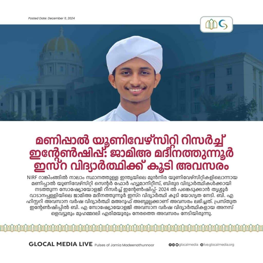 മർകസ് ഗാർഡൻ: NIRF റാങ്കിംങ്ങിൽ നാലാം സ്ഥാനത്തുള്ള ഇന്ത്യയിലെ മുൻനിര യൂണിവേഴ്സിറ്റികളിലൊന്നായ മണിപ്പാൽ യൂണിവേഴ്സിറ്റി സെന്റർ ഫോർ ഹ്യുമാനിറ്റീസ്‌, ബിരുദ വിദ്യാർത്ഥികൾക്കായി നടത്തുന്ന സോഷ്യോയോളജി റീസർച്ച് ഇന്റേൺഷിപ്പ്- 2024 ൽ പങ്കെടുക്കാൻ ജാമിഅ മദീനത്തുന്നൂർ ഇസ്‌റ വിദ്യാർത്ഥി കൂടി യോഗ്യത നേടി. ബി. എ ഹിസ്റ്ററി അവസാന വർഷ വിദ്യാർത്ഥി മഅ‌റൂഫ് അബ്ദുല്ലക്കാണ് അവസരം ലഭിച്ചത്.