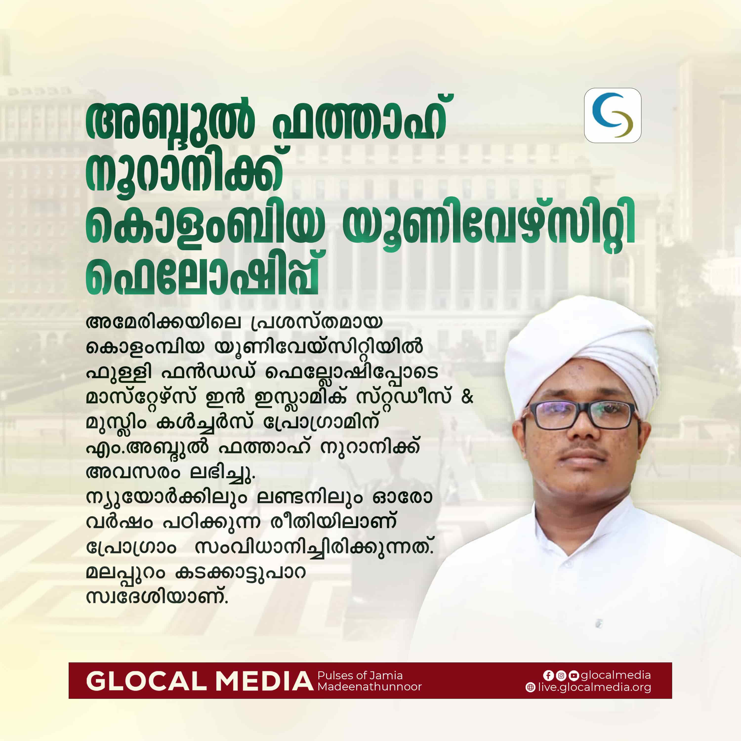 അമേരിക്കയിലെ പ്രശസ്തമായ കൊളംമ്പിയ യൂണിവേയ്സിറ്റിയിൽ ഫുള്ളി ഫൻഡഡ് ഫെല്ലോഷിപ്പോടെ മാസ്റ്റേഴ്സ് ഇൻ ഇസ്ലാമിക് സ്റ്റഡീസ് ആൻഡ് മുസ്ലിം കൾച്ചർസ് പ്രോഗ്രാമിന് എം.അബ്ദുൽ ഫത്താഹ് നുറാനിക്ക് അവസരം ലഭിച്ചു.ന്യുയോർക്കിലും ലണ്ടനിലും ഓരോ വർഷം പഠിക്കുന്ന രീതിയിലാണ് പ്രോഗ്രാം സംവിധാനിച്ചിരിക്കുന്നത്.