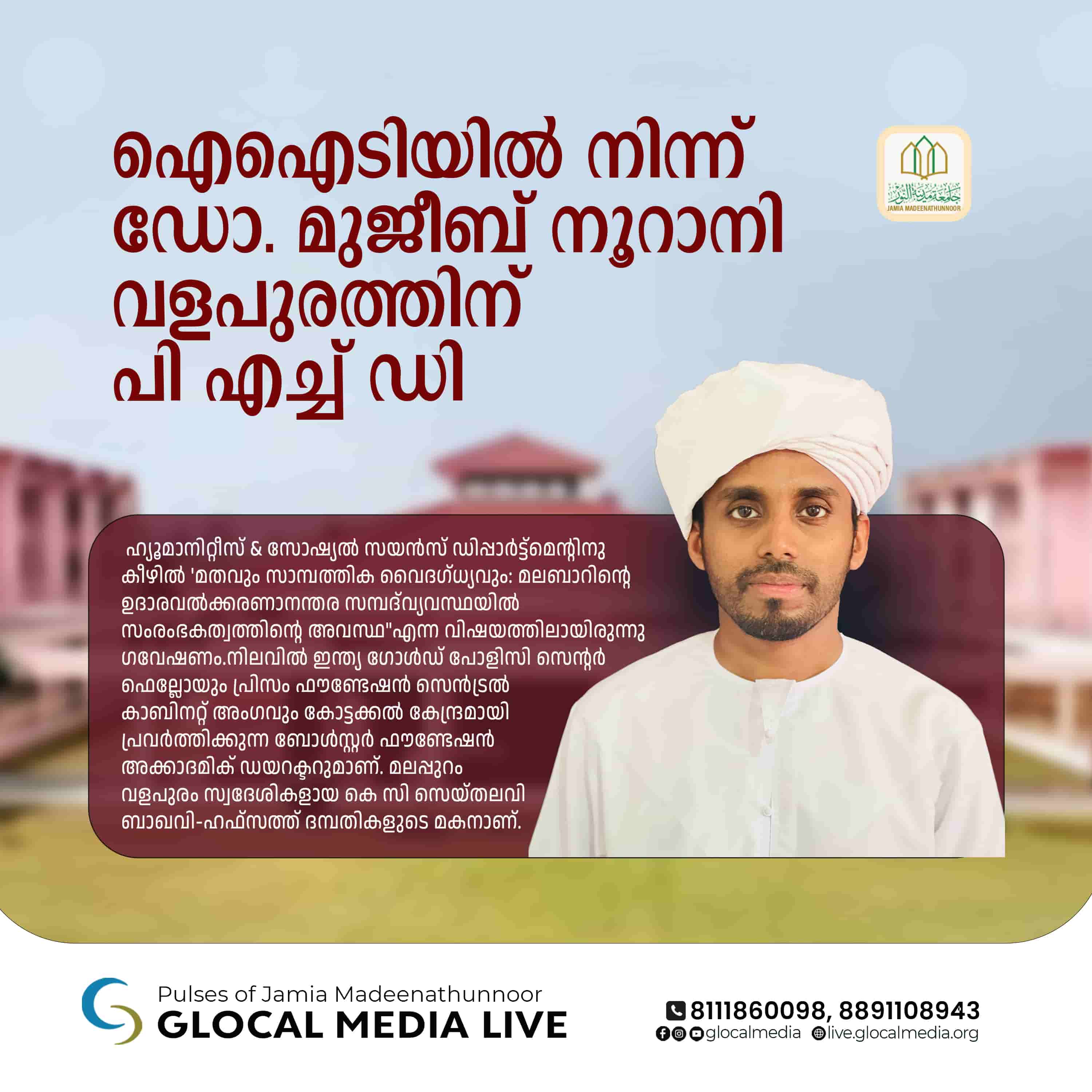 കോഴിക്കോട് I മർകസ് സെൻ്റർ ഓഫ് എക്സലൻസായ ജാമിഅ മദീനത്തുന്നൂർ പൂർവ്വവിദ്യാർത്ഥി ഡോ.മുജീബ് റഹ്മാൻ നൂറാനി ഐ ഐടി കാൺപൂരിൽ നിന്ന് പി. എച്ച്.ഡി. കരസ്ഥമാക്കി. ഹ്യൂമാനിറ്റീസ് ആൻഡ് സോഷ്യൽ സയൻസ് ഡിപ്പാർട്ട്മെൻ്റിനു കീഴിൽ ‘മതവും സാമ്പത്തിക വൈദഗ്ധ്യവും: മലബാറിൻ്റെ ഉദാരവൽക്കരണാനന്തര സമ്പദ്‌വ്യവസ്ഥയിൽ സംരംഭകത്വത്തിൻ്റെ അവസ്ഥ”എന്ന വിഷയത്തിലായിരുന്നു ഗവേഷണം .ജെ എം എം എ ,റൂട്ട്ലെഡ്ജ്(2022),ജേണൽ ഓഫ് ലീഗൽ ആന്ത്രോപോളജി(2022) തുടങ്ങിയ പ്രധാന പബ്ലിക്കേഷനുകളുണ്ട്. അമേരിക്കൻ ഇന്ത്യ ഫൗണ്ടേഷൻ്റെ വില്ല്യം ജെ.ക്ലിൻ്റൻ ഫെല്ലോഷിപ്പ് – 2017-18, ഐഐടി