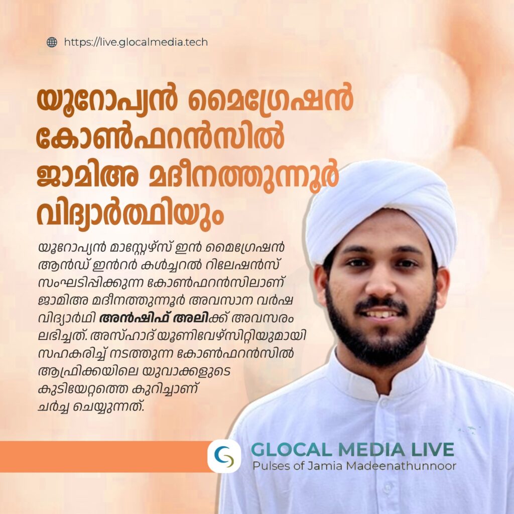 മർകസ് ഗാർഡൻ : യൂറോപ്യൻ മാസ്റ്റേഴ്സ് ഇൻ മൈഗ്രേഷൻ ആൻഡ് ഇൻറർ കൾച്ചറൽ റിലേഷൻസ് സംഘടിപ്പിക്കുന്ന കോൺഫറൻസിൽ ജാമിഅ മദീനത്തുന്നൂർ അവസാന വർഷ വിദ്യാർഥി അൻഷിഫ് അലിക്ക് അവസരം. അസ്ഹാദ് യൂണിവേഴ്സിറ്റിയുമായി സഹകരിച്ച് നടത്തുന്ന കോൺഫറൻസിൽ ആഫ്രിക്കയിലെ യുവാക്കളുടെ കുടിയേറ്റത്തെ കുറിച്ചാണ് ചർച്ച ചെയ്യുന്നത്. ‘ഗുജറാത്തിലെ സിദ്ദിസ് വംശജർ; അവരുടെ ചരിത്രം, പാരമ്പര്യം, പ്രതിനിധാനം എന്നിവയുടെ സമഗ്ര വിശകലന‘ ത്തെ അധികരിച്ചാണ് പേപ്പർ അവതരിപ്പിക്കുന്നത്. ചരിത്രത്തിന്റെ പല ഘട്ടങ്ങളിലായി ഇന്ത്യയിലെത്തിച്ചേർന്ന ആഫ്രിക്കക്കാരുടെ പിൻഗാമികളായ, നിലവിൽ ഇന്ത്യയുടെ വിവിധ ഭാഗങ്ങളിലായി, പ്രധാനമായും ഗുജറാത്തിൽ വസിക്കുന്ന വിഭാഗമാണ് സിദ്ധികൾ.ഫുള്ളി ഫണ്ടഡ് കോൺഫ്രൻസ് ഉഗാണ്ടയിൽ വെച്ച് നവംബർ 28 മുതൽ 30 വരെയാണ് നടക്കുന്നത്.യൂറോപ്പ്യൻ യൂണിയനാണ് ഫണ്ട് നൽകുന്നത്.