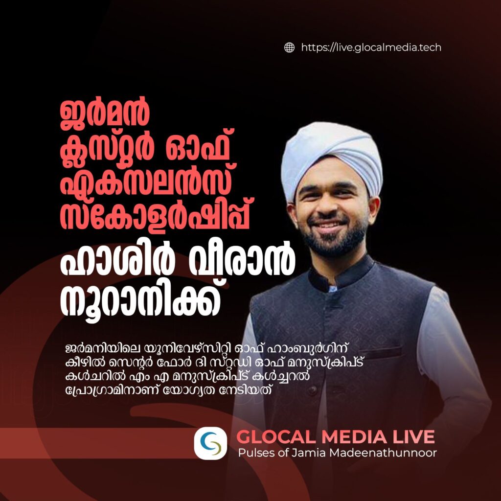 മർകസ് ഗാർഡൻ | ജാമിഅ മദീനതുന്നൂർ പൂർവ വിദ്യാർഥി ഹാശിർ വീരാൻ നൂറാനിക്ക് ജർമനിയുടെ ക്ലസ്റ്റർ ഓഫ് എക്സലൻസ് സ്കോളർഷിപ്പ് ലഭിച്ചു. ജർമനിയിലെ യൂനിവേഴ്സിറ്റി ഓഫ് ഹാംബുർഗിന് കീഴിലുള്ള ഗവേഷണ സ്ഥാപനമായ സെന്റർ ഫോർ ദി സ്റ്റഡി ഓഫ് മനുസ്ക്രിപ്ട് കൾചറിൽ എം എ മനുസ്ക്രിപ്ട് കൾച്ചറൽ പ്രോഗ്രാമിനാണ് അവസരം ലഭിച്ചത്.