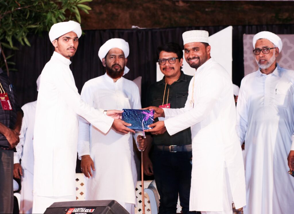 ഫോട്ടോ: മർകസ് ഗാർഡൻ ഉർസേ അജ്മീറിന്റെയും ജാമിഅ മദീനതുന്നൂർ കോൺവൊക്കേഷന്റെയും വേദിയിൽ വിദ്യാർത്ഥിക്ക് എക്കമൗണ്ട് ബിൽഡർസ് മാനേജിങ് ഡയറക്ടർ യഹ്യ സഖാഫി ഉപഹാരം നൽകുന്നു