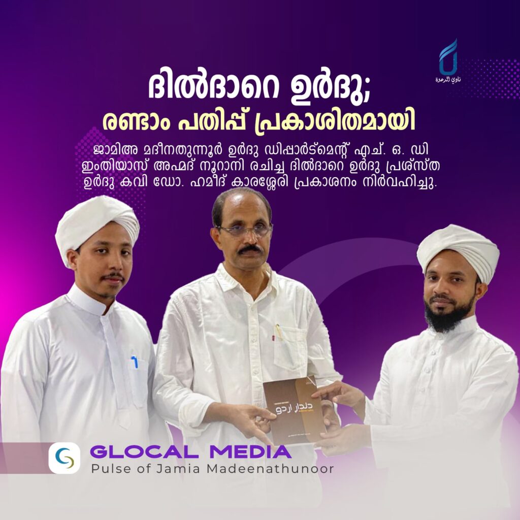 പൂനൂർ: ദിൽദാറെ ഉർദു പുസ്തകത്തിന്റെ രണ്ടാം പതിപ്പ് പ്രകാശിതമായി. ജാമിഅ മദീനതുന്നൂർ ഉർദു ഡിപ്പാർട്മെന്റ് എച്. ഒ. ഡി ഇംതിയാസ് അഹ്മദ് നൂറാനി രചിച്ച ദിൽദാറെ ഉർദു പ്രശ്സ്ത ഉർദു കവി ഡോ. ഹമീദ് കാരശ്ശേരി പ്രകാശനം നിർവഹിച്ചു. നവംബർ ഒൻപത് വേൾഡ് ഉർദു ദിനത്തിന്റെ ഭാഗമായി ഇന്നലെ നടന്ന രംഗേ സുഖൻ ശില്പശാലയിലാണ് പുസ്തകം പ്രകാശിതമായത്. ഗ്ലോക്കൽ മീഡിയ പ്രസാദനം ചെയ്യുന്ന പ്രാദമിക ഉർദു പഠിതാകകൾക്ക് സരളമായി തയ്യാറക്കിയ കൃതിയുടെ വില 120 രൂപയാണ്. കോപ്പികൾ ആവശ്യമുള്ളവർ +91 79023 86823 നമ്പറിൽ ബന്ധപ്പെടുക.